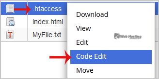 5. Right click on the .htaccess file and then on "Edit" or "Code Edit" in the Context Menu.