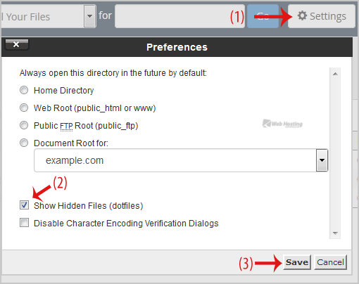 5. If the .htaccess file does not show, click on the "Settings" button in the File Manager. You can find the "Settings" button on the Right Side of the top menu. A new small window will open. Mark the "Show Hidden Files (Dotfiles)" option and click on the "Save" button. You will be able to see the .htaccess file. If it does not exist, create a new one.