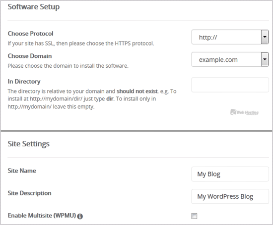 • In Directory: If you want to install this in a directory, for example example.com/directory, enter the directory name. Otherwise, leave this blank to install in your main domain example.com