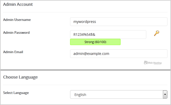 • Admin Username: Your new WordPress username (for security reason do not use the "Administrator" or the "Admin" username.