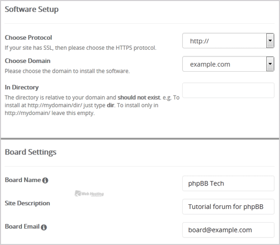 • In Directory: If you want to install this in a directory, for example example.com/forums, enter the directory name. Otherwise, leave this blank to install in your main domain example.com