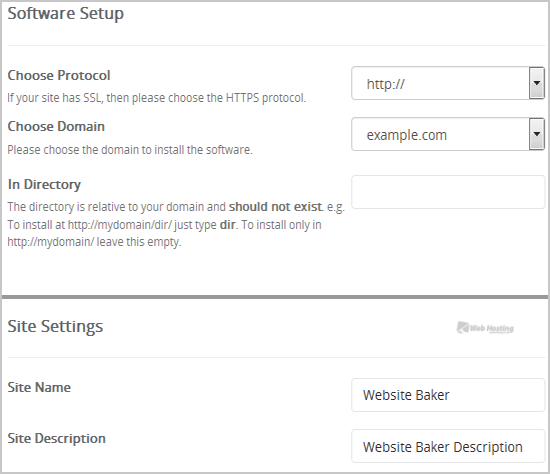 - In Directory: If you want to install this in a directory, for example example.com/directory, enter the directory name. Otherwise, leave this blank to install in your main domain example.com