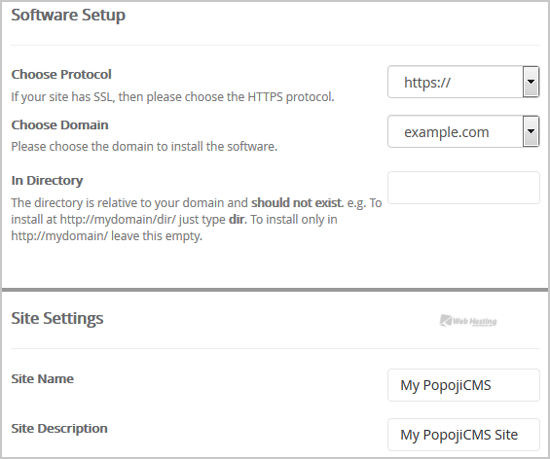 - In Directory: If you want to install this in a directory, for example example.com/directory, enter the directory name. Otherwise, leave this blank to install in your main domain example.com