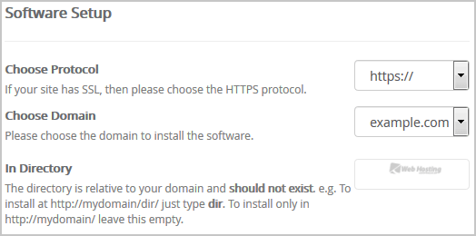 • In Directory: If you want to install this in a directory, for example example.com/directory, enter the directory name. Otherwise, leave this blank to install in your main domain example.com